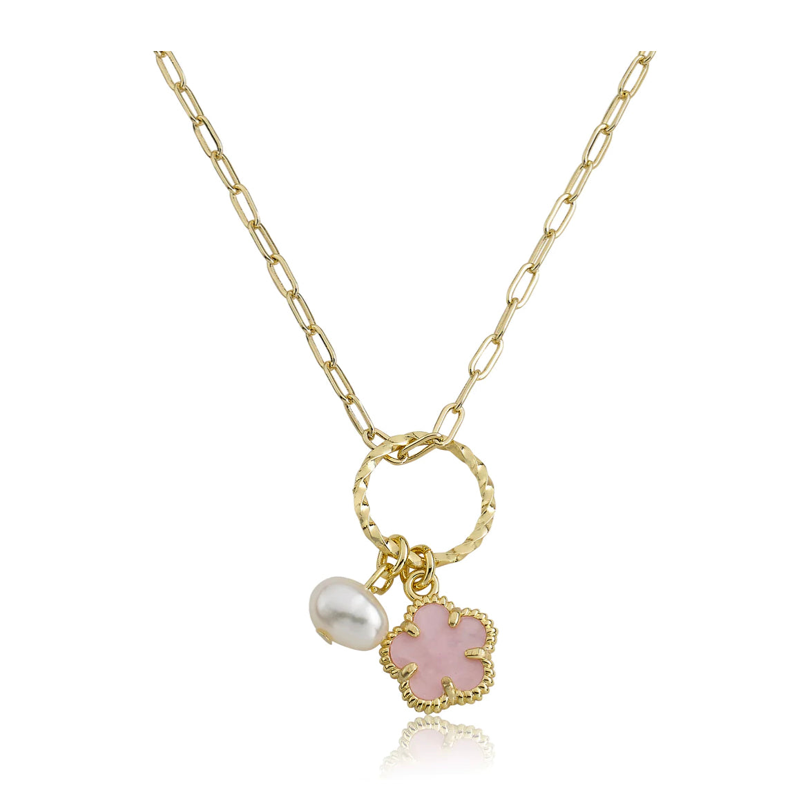LMTS Classic! Paperclip Link Chain Necklace With Mother of Pearl Flower and Fresh Water Pearl on Rope Ring Pendant